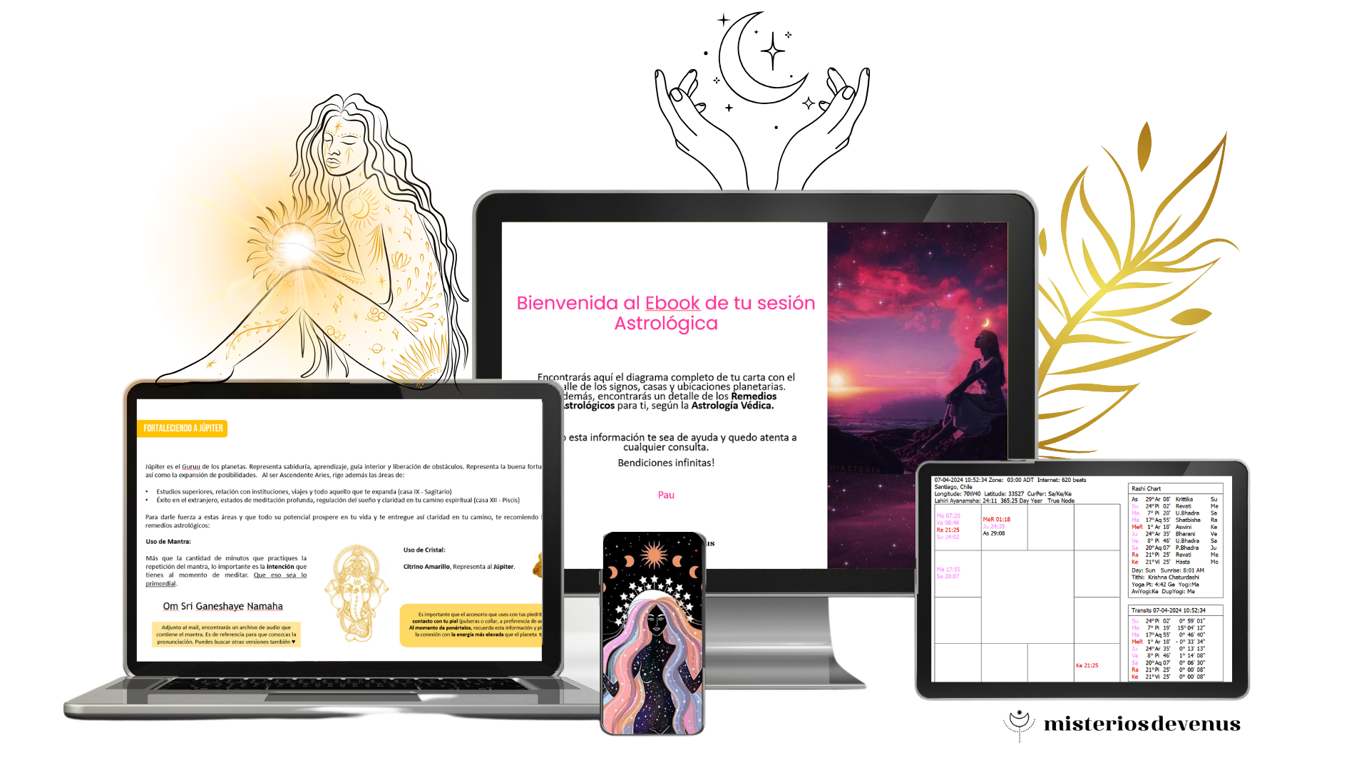 Con los puntos clave de tu carta y tus remedios astrológicos, para que tengas una guía práctica de cómo accionar a futuro más alineada.